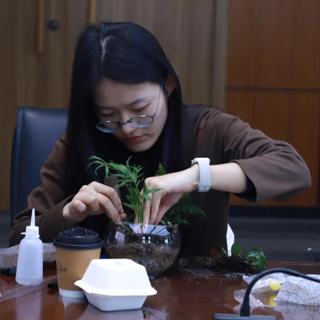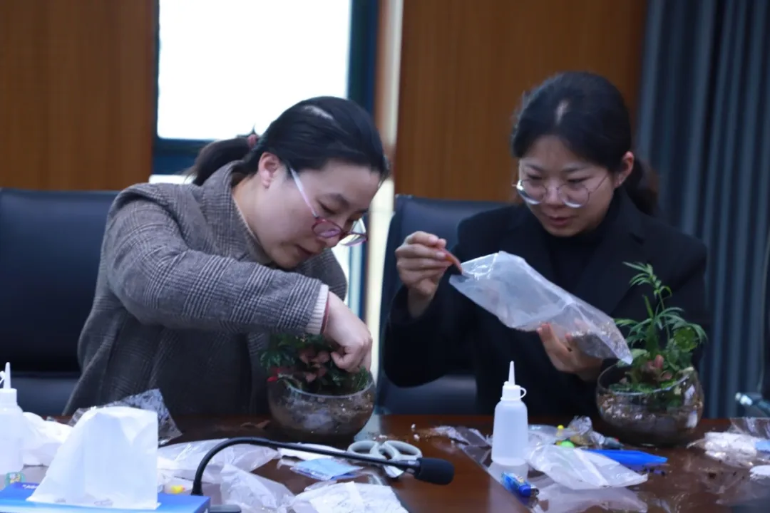 活動特邀專業(yè)指導(dǎo)師全程教學,指導(dǎo)老師詳細地向大家講解了微景觀的制作步驟和注意事項。在講師的耐心指導(dǎo)下,大家先在透明玻璃盆底部鋪上一層薄薄的小石子作為瀝水層,以確保植物能夠良好地生長;接著用種植土填滿盆內(nèi)的大部分空間,為綠植提供充足的養(yǎng)分;隨后,大家小心翼翼地將綠植放入盆中,根據(jù)自己的審美和創(chuàng)意,將植物擺放成高低錯落的層次感;最后,在微景觀中增添一些可愛的卡通玩偶,讓整個景觀顯得更加生動有趣。在輕松歡快的空間里,全體女職工放下工作壓力,以巧思妙想構(gòu)筑春日盛景,一盆盆綠植在女職工們的指尖流轉(zhuǎn)成詩意盎然的藝術(shù)佳作。